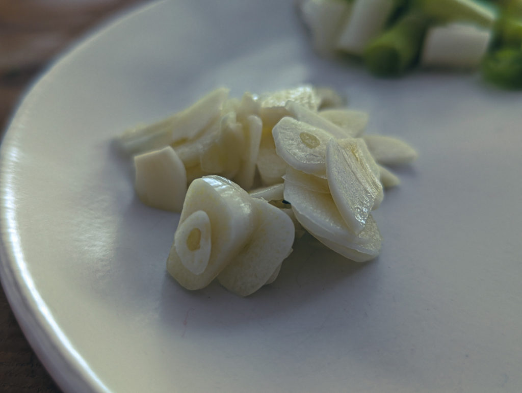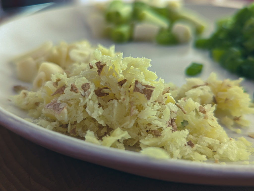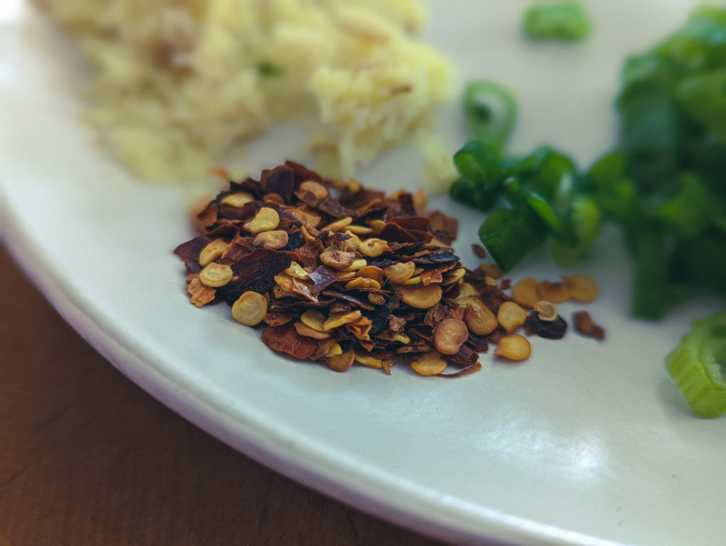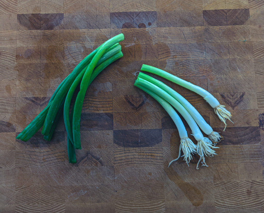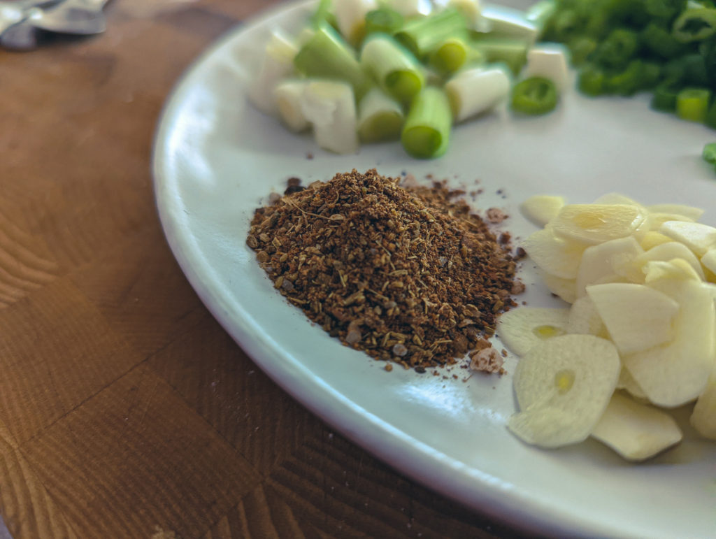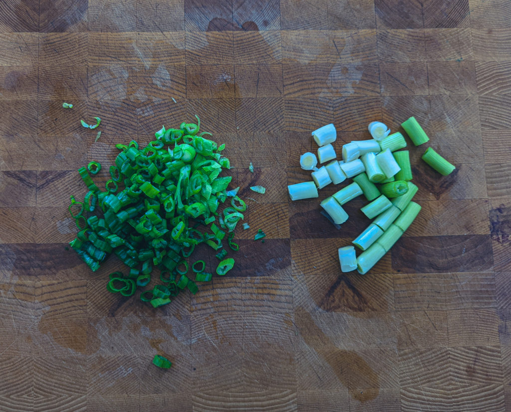 Any stir-fry will benefit from a bit of onion. For this ground beef and green bean stir-fry, I use green onions, but you can use any other type of onion you want. If you use white, yellow, or red onions, use about a quarter of a cup of sliced onions. If using green onions, separate the whites and the greens as I did in the picture below. Cut the whites into finger-width pieces, and thinly slice the greens. The greens and the whites of the onion cook differently so we don't want to add them to the stir-fry at the same time. The whites will go in first and cook with the other ingredients. The greens will be added near the end of cooking to add a fresh flavour to the dish. Along with the green onion, you need two cloves of thinly sliced garlic, two teaspoons to a tablespoon of minced or grated ginger. If you add a little more or less it isn't going to change too much. Finally, you will need half a teaspoon of crushed red pepper flakes and two teaspoons of Chinese 5 Spice.