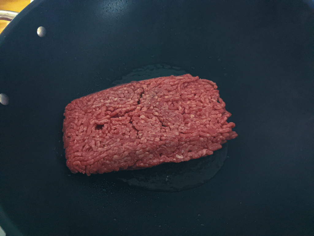 The key to a good stir-fry is a very hot wok (or pan if you don't have a wok). The wok has to be hot so that the moisture that comes off the ingredients while cooking hits the surface of the pan and evaporates. If the wok isn't hot enough, all that moisture will hit the surface of the pan, turn from a gas to a liquid, and pool further cooling down your wok. This leads to a mushy boiled dinner rather than a crisp and fresh-tasting stir-fry. You can read more about stir-fry technique here. In the meantime, put your wok on the burner, crank it up to high, and let it sit for a minute or two to get really hot. Next, add a teaspoon or two of cooking oil (I like peanut oil for stir-frying). Swirl the oil around the wok and add in the ground beef.