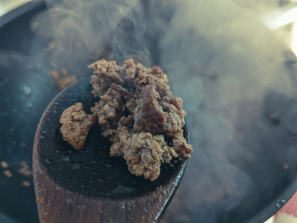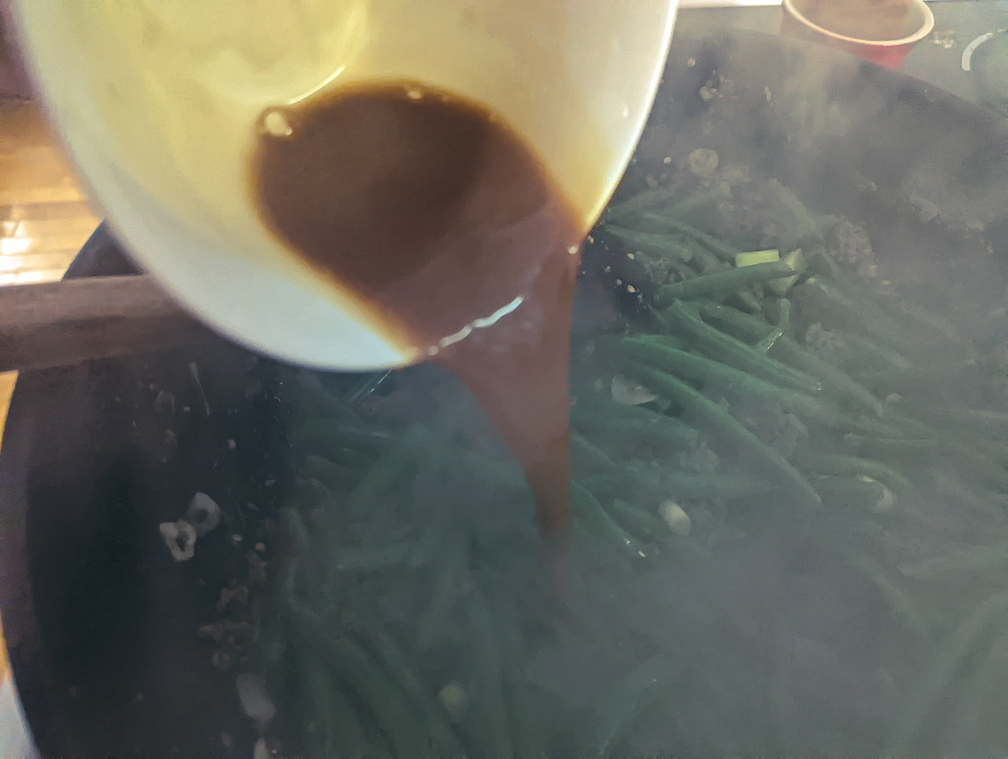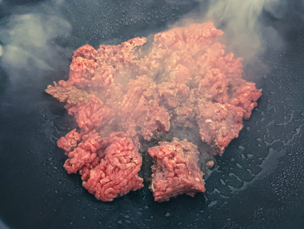 There is a common mistake that people make with ground beef. When a recipe says to "brown the ground beef" they see that and think it means to "grey the ground beef". Browning is a form of caramelization. Think about the surface of a burger cooked in a pan or a seared steak. That deep mahogany brown is what you want. This takes a little time but it is well worth the wait as the flavour will be deeper and richer. So, put the beef in the pan, break it up a little bit, then leave it alone for a few minutes. Let the bottom of the beef turn that deep brown before you stir it. Then, stir it and leave it alone for another few minutes. Once most of the meat is browned, and it is all cooked, drain the excess fat and put the wok back on the burner.