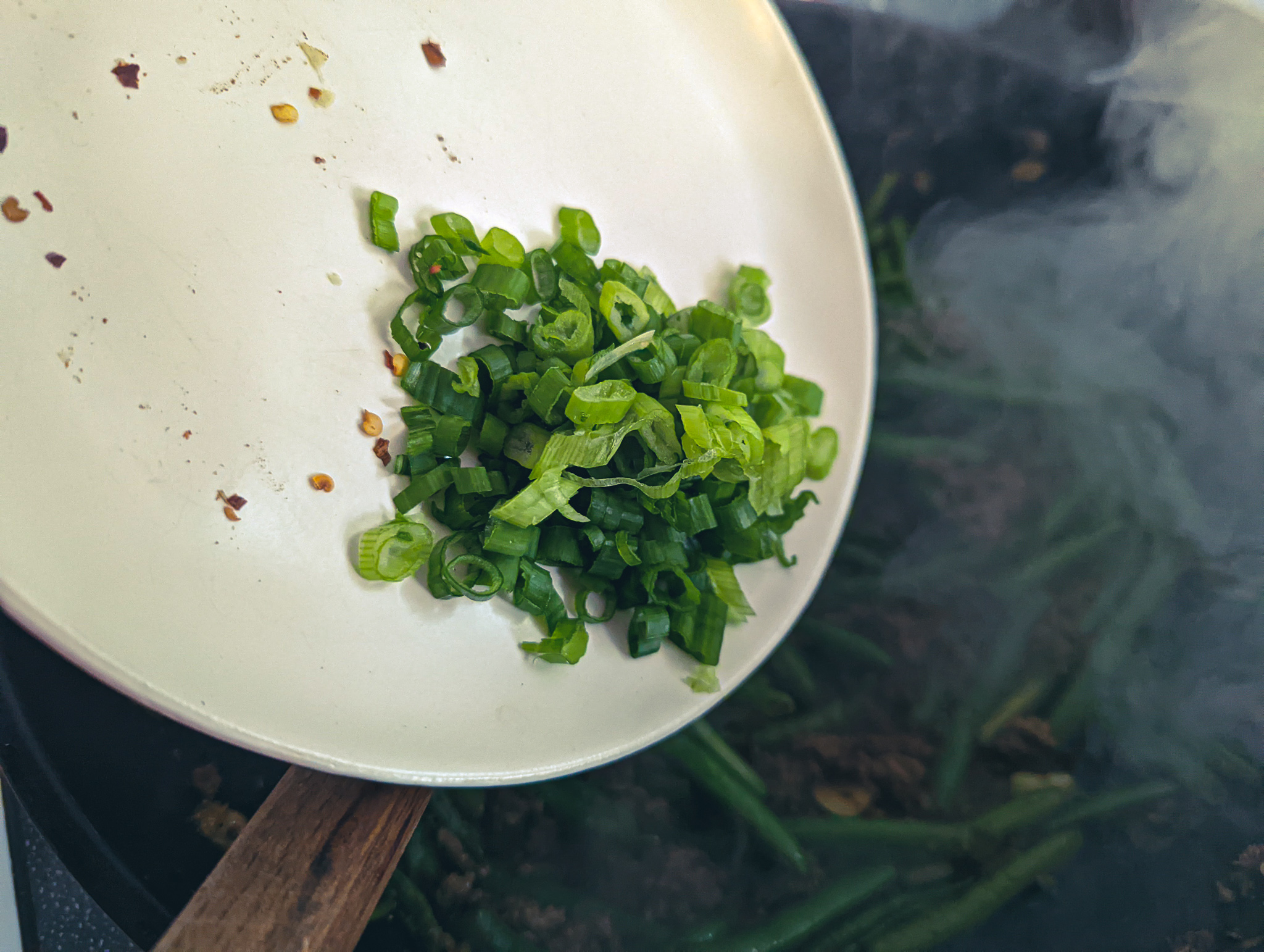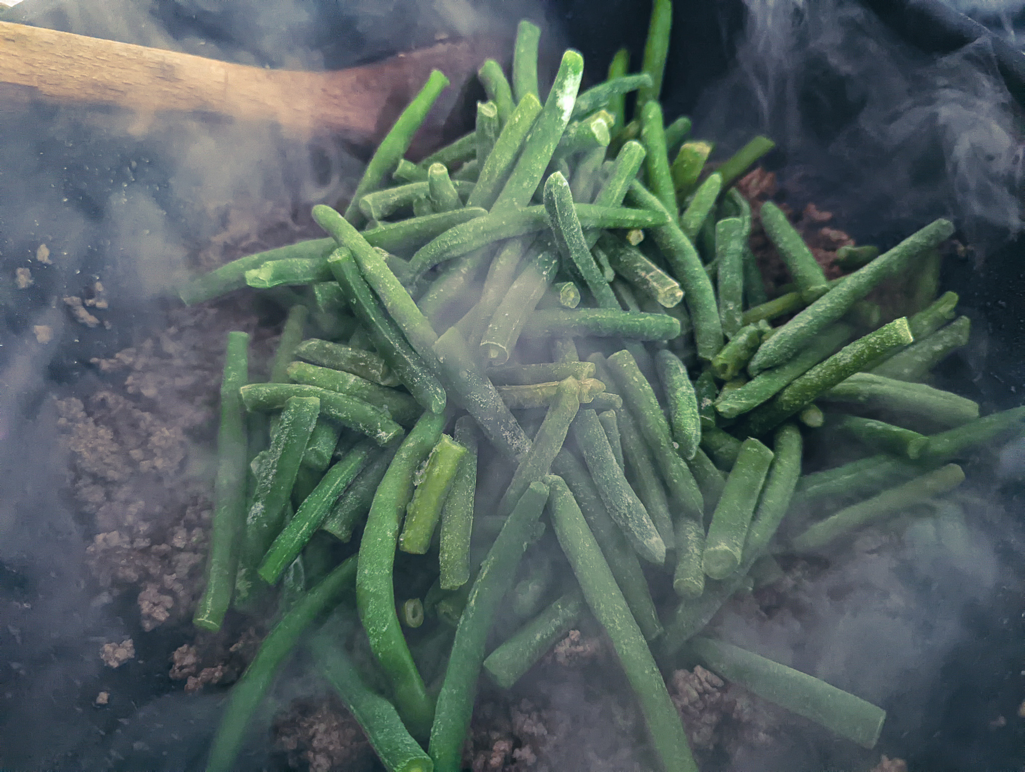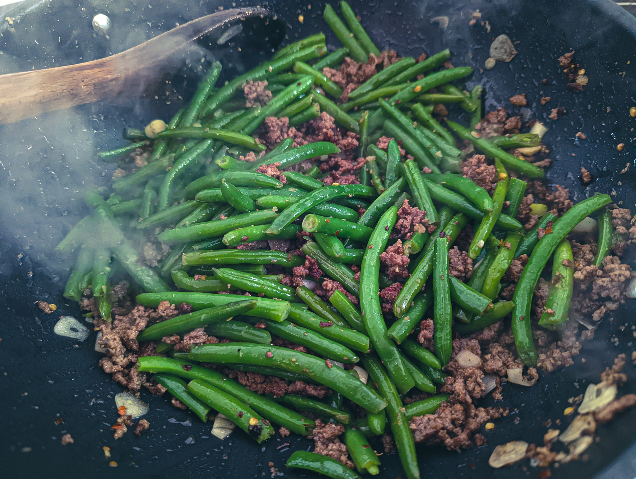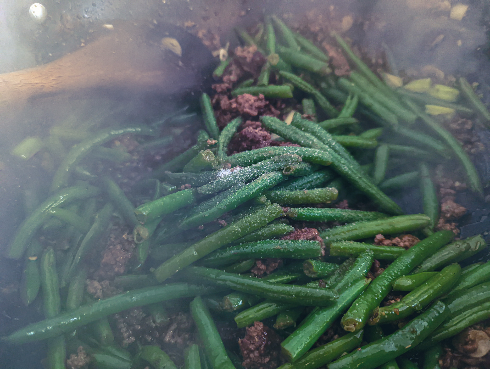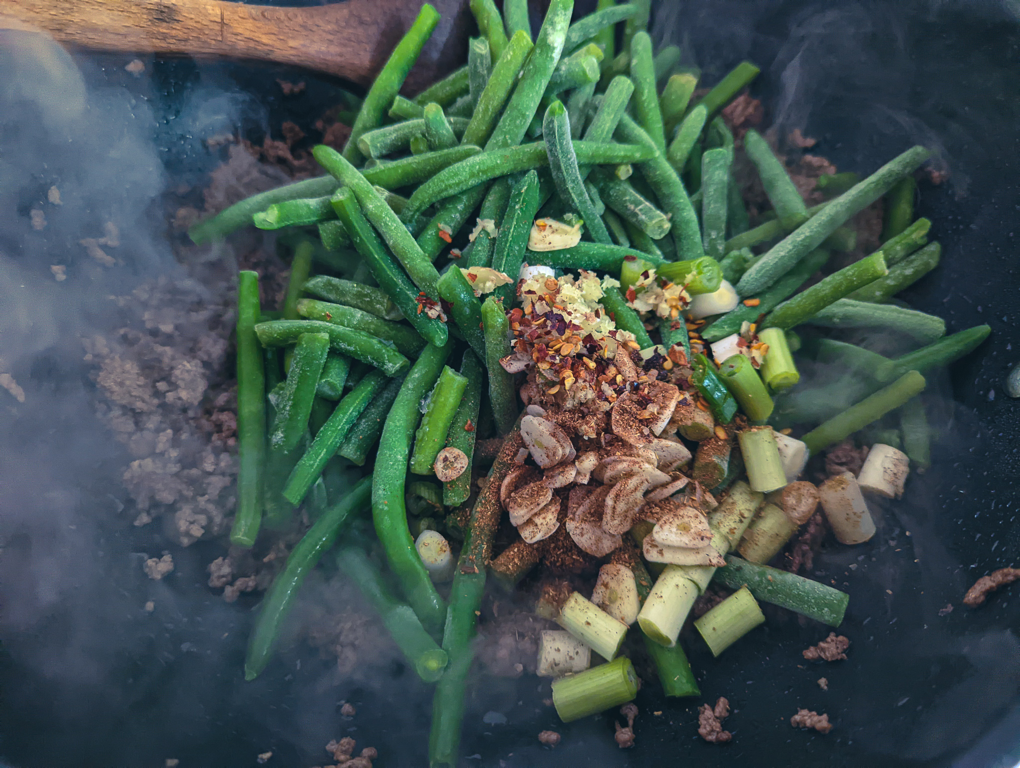 The ground beef is brown, you drained the excess oil, and the pan is back on the burner. Make sure the pan is very hot again then add the frozen green beans, garlic, ginger, Chinese 5 Spice, and crushed red pepper flakes. Now stir-fry for about three to four minutes or until the green beans are no longer frozen. This may take a little longer depending on how hot your wok was when you added everything in. Also, if you notice that your wok is cooling down push the green beans to the sides and let it heat up. Once the green beans are no longer frozen, stir the sauce then pour it into the wok. Stir-fry until the sauce is thick and the green beans are tender. Take the wok off the heat and stir in the tops of the green onions. Taste a green bean and a bit of the meat. Add a bit of salt and pepper as needed.